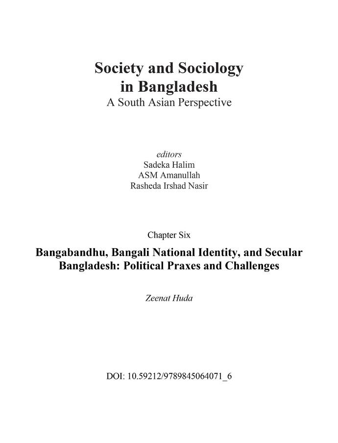 Huda, Zeenat, AU. Bangabandhu, Bangali National Identity, and Secular Bangladesh: Political Praxes and Challenges. Society and Sociology in Bangladesh: A South Asian Perspective. Dhaka, Bangladesh. https://dx.doi.org/10.59212/9789845064071_6